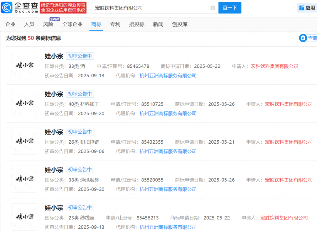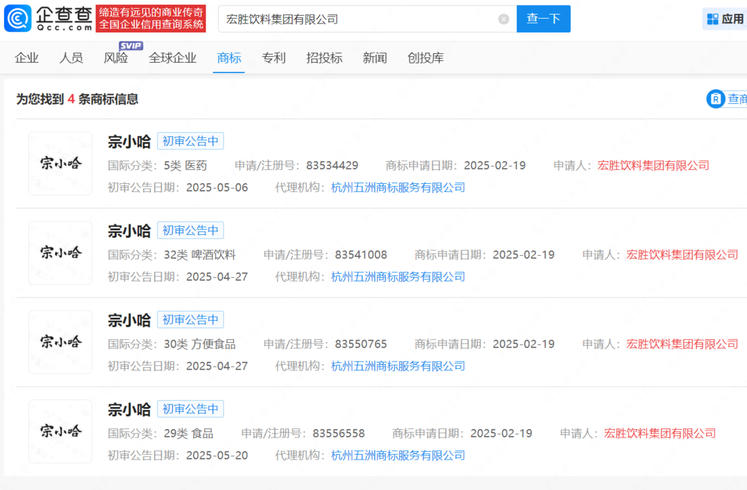 企查查APP显示升宏网,今年2月以来,宗馥莉任董事的宏胜饮料集团有限公司申请注册多枚“娃小宗”、“娃小哈”、“宗小哈”商标,国际分类涉及啤酒饮料、方便食品、材料加工等。目前“娃小哈”商标状态在注册申请中,“娃小宗”、“宗小哈”商标处于初审公告状态。